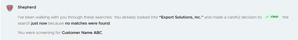 Successful screening requires that it be done at several checkpoints within the export process. This means that screening could be taking place several times over the course of many months. Once your search is saved in Shepherd, it will remind you of when you screened last and what determination you made last time.