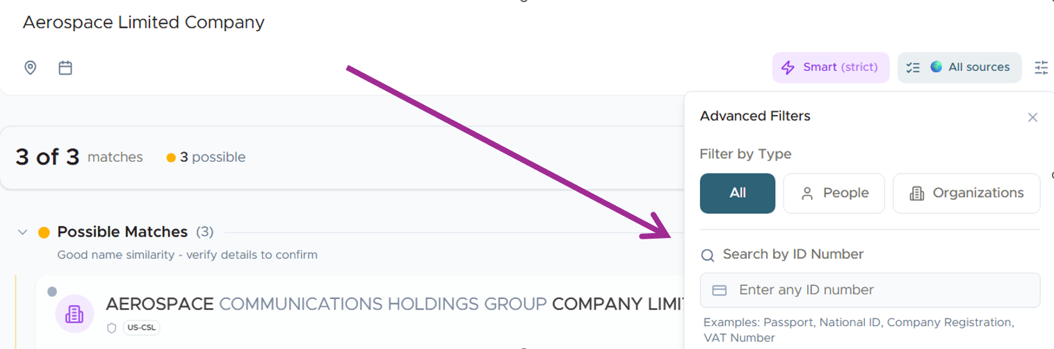 Like the above scenario, screening Aerospace Limited Company with fuzzy “off” presented 2 results, whereas the fuzzy “on” output produced 99 results. Shepherd allows users to input additional details, such as the Business Registratio,n to assist with clearing all the hits.